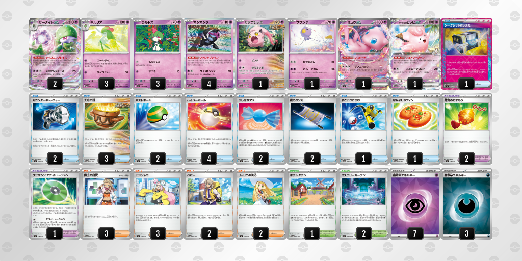 - 《サーナイトex》ライン(ラルトス3 / キルリア3 / サーナイトex2):デッキの根幹。2体の《サーナイトex》を立てることを目指すため、進化元は厚めの3枚採用。《キルリア》が倒されても後続を育てられるようにしています。